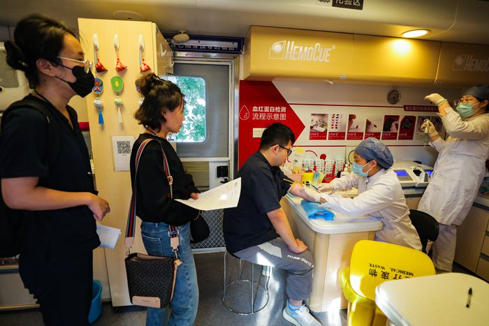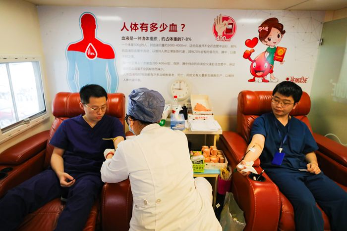 与蔡慧慧一起走进北京天坛医院献血方舱的,还有一百多名她的同事。在医院发出组织职工无偿献血的号召后,全院党员干部职工踊跃报名,“作为医务工作者,我们更明白血液对于患者的意义”。