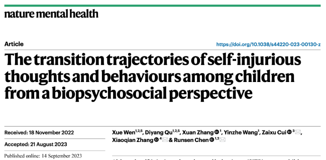 近期,五里坨医院张小芊与清华大学卫健学院儿童青少年心理健康实验室团队以及北京脑科学与类脑研究中心在《自然》杂志子刊Nature Mental Health上联合发表了The transition trajectories of self-injurious thoughts and behaviours among children from a biopsychosocial perspective的研究文章,揭示了儿童自伤意念和行为(Self-Injurious Thoughts and Behaviours,SITB)转变相关的关键生物-心理-社会因素,包括广泛性精神病理因子(p-factor)。