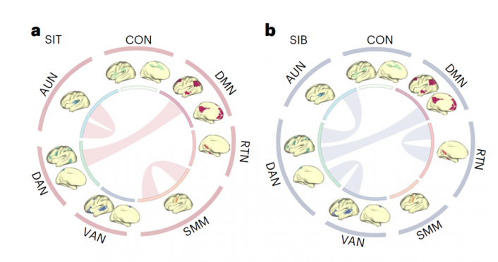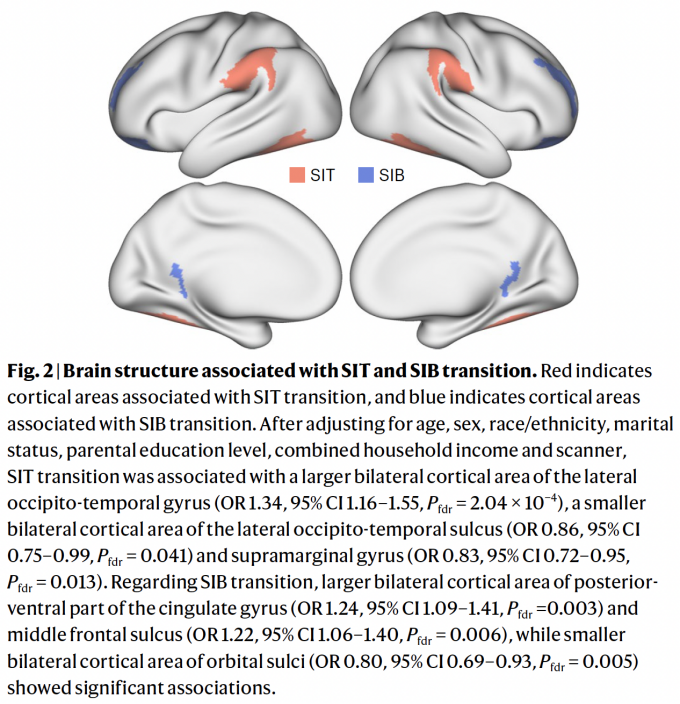 本研究覆盖7270名儿童,运用生物-心理-社会理论框架,分别纳入脑结构和脑网络、双因子模型、学校支持和家庭支持,探索儿童1年后SITB转变的相关因素。结果发现SITB转变与大脑背外侧前额叶皮层和后扣带皮层的结构改变,以及默认网络、背侧注意网络,腹侧注意网络之间的功能连接改变相关。此外,高行为抑制和高广泛性精神病理因子得分被识别为SITB转变的风险因素,而充足的家庭支持和学校支持则作为保护因素而存在。