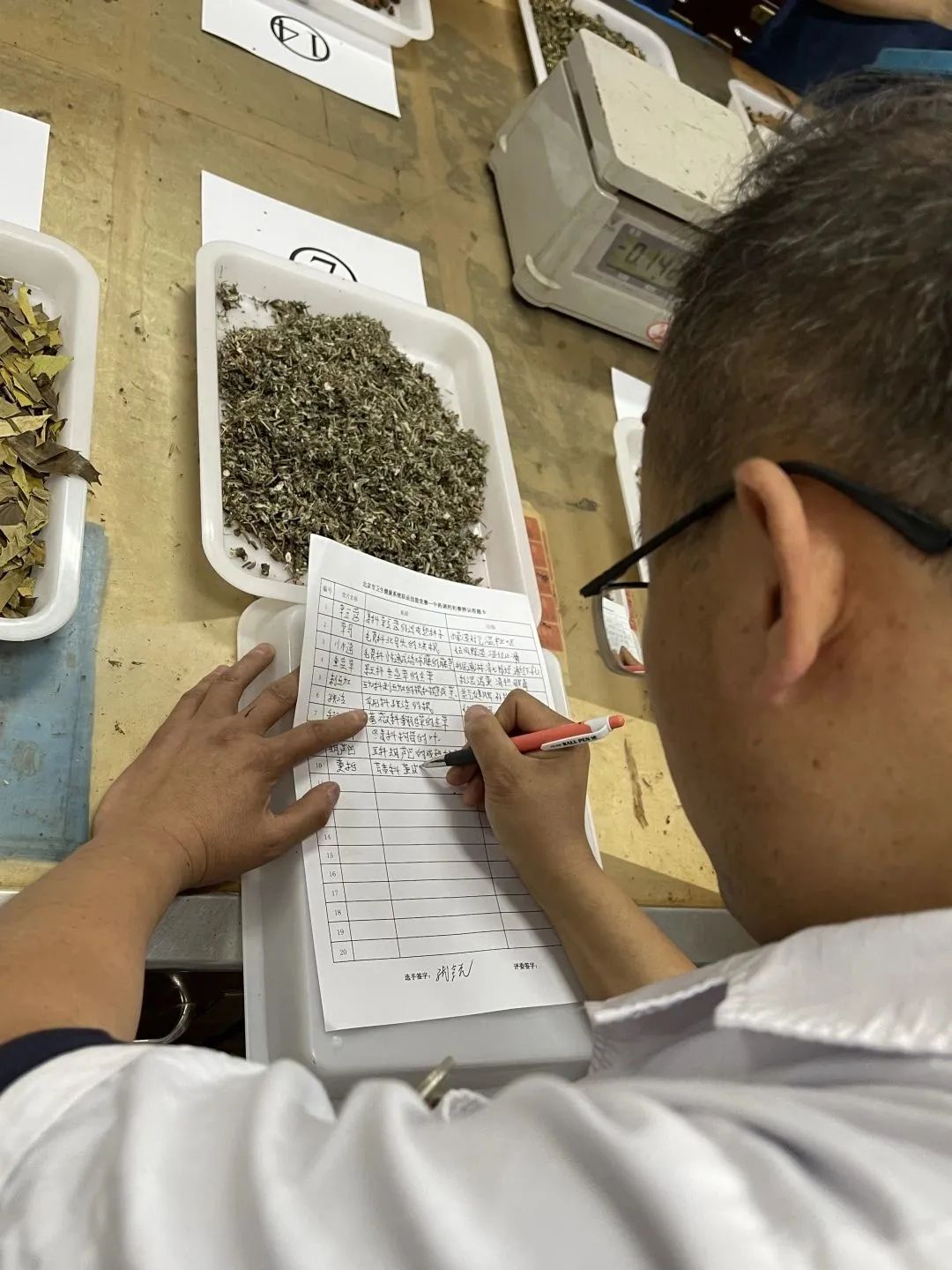此次比赛分为实操考试和理论考试两个环节。实操考试分为中药饮片辨识和中药饮片调剂两个部分。首先进行的是中药饮片辨识环节,参赛选手必须在20分钟之内辨识20种中药饮片,写出其药名、药用植物来源、临床功效。平均1分钟内不但要正确辨识中药,还要完整准确写出中药的科属、用药部位和详细的功效。在裁判长宣布比赛开始后,选手们对每一味药都仔细辨识,通过眼观、口尝、鼻闻、手触……之后便迅速写出辨识的结果。这一环节体现了中药调剂人员准确的认药能力和丰富的中药学知识。