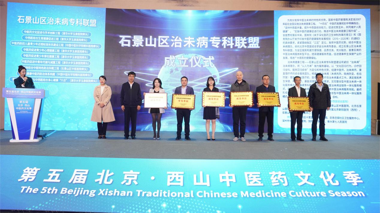 在开幕式的发布环节中,举行了石景山区治未病专科联盟成立仪式,并为唐启盛、高彦彬、冯兴中、谢立科等四位首都名中医颁发首都名中医“上工治未病”指导老师聘书。