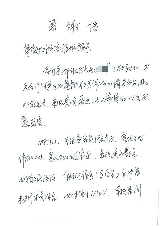 感谢信中写道:“尊敬的航空总医院领导······今天我们怀着无比尊敬和感谢的心情来书写内心的激动,来向贵院表达病人家属的一份欣慰感受。”毛女士讲述了患者就诊经历和家属感受,毛女士母亲杨老太85岁,因突发脑出血急诊紧急入院,幸得刘磊团队紧急救治、贴心照顾,帮助老人安全度过危险期。术后,老人精神状态、面色、肢体活动……一切向好发展。