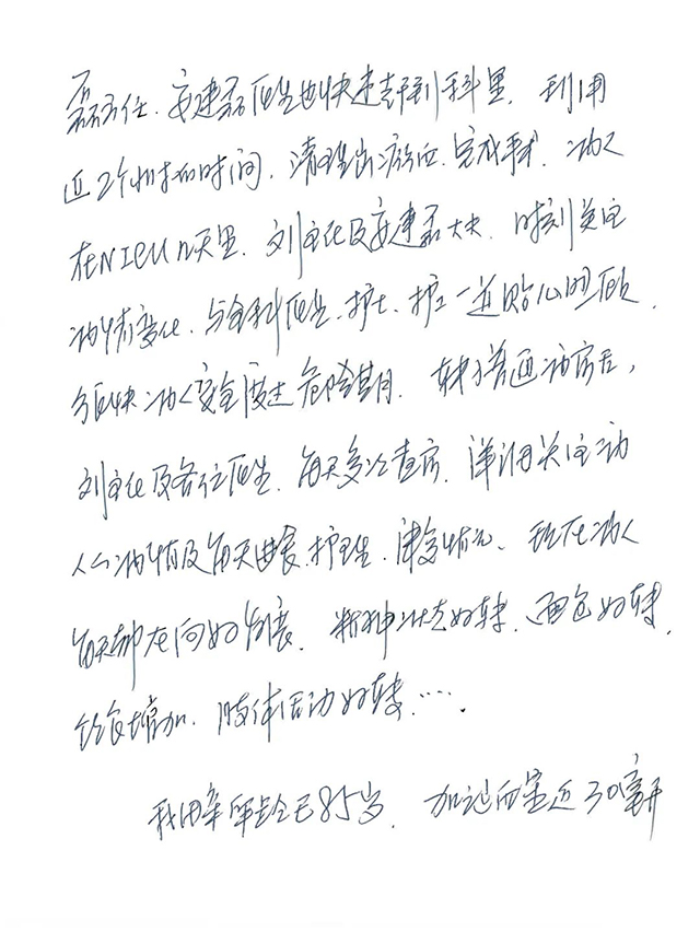近日,航空总医院神经外九科主任刘磊收到一封患者家属毛女士的亲笔手写信。信中详细介绍了毛女士的母亲来院获救治、最终平安出院的情况,以热情洋溢的文字向医院及医生表达了感激之情。