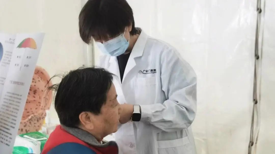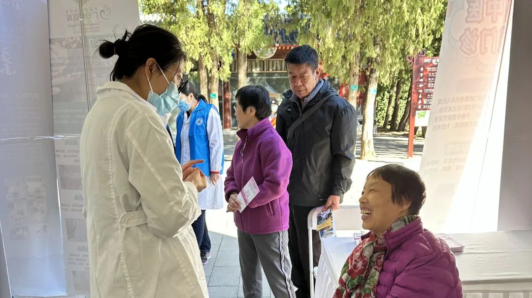 内分泌科护师张鑫焱为百姓发放健康宣教彩页,开展健康咨询宣教
