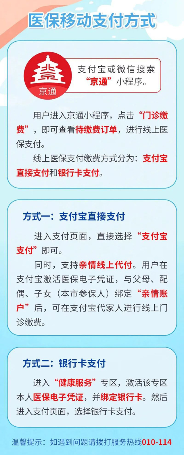 谈到此次服务升级,相关负责人表示,“移动支付功能开通后,北京医保患者既可以选择在自助机、缴费窗口缴费,也可以在手机上缴费,多元化的选择,让北京医保患者就医更见便捷!“ 此外,之前通过114电话预约的医保患者,需要到医院完成取号、缴费才能就诊,现在通过手机即可完成在线缴费。