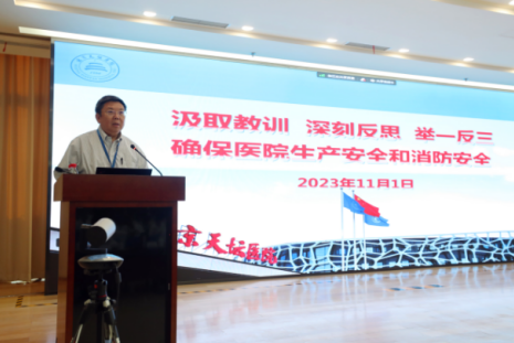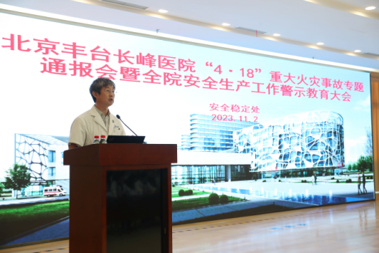 同时,医院利用早交班、院周会等,第一时间通报事故调查情况,传达上级和医院党委有关安全生产工作的精神。11月1日,在院周会上,医院向全体中层干部专题通报 “4.18”重大火灾事故调查结果、追责问责情况等,传达学习北京市和上级部门贯彻落实安全生产和火灾隐患大排查大整治工作要求。会议要求,全体中层干部要深刻认识事故暴露出的问题和漏洞,举一反三,要发挥消防安全第一责任人作用,履行好科室消防安全主体责任,严格落实本部门全员安全生产责任制和全员消防安全责任制,督促并带动全体职工落实各自岗位的消防安全职责;实行安全隐患全院实名通报制度、安全隐患与安全管理绩效挂钩兑现经济处罚等,防止“大错不犯,小错不断”“立整立改,改完再犯”等问题出现。