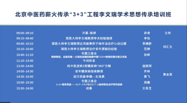 本次培训班我们再次邀请到李老的传承弟子北京医院李怡教授及其团队成员黄飞、常婧舒、范婷三位副主任医师就国医大师李文瑞教授独到的学术思想、诊疗思路等进一步分享讲解,以期更为深入学习国医大师学术思想,提高工作室分站建设水平。同时我们还邀请到全国名中医河南省开封市中医院庞国明院长、北京燕化医院齐林院长为本次培训班授课,通过本次学术交流以期将“大家”经验应用实际,解决患者切实问题,也希望本次培训班作为纽带加强地区间学习沟通,扩大社会影响。