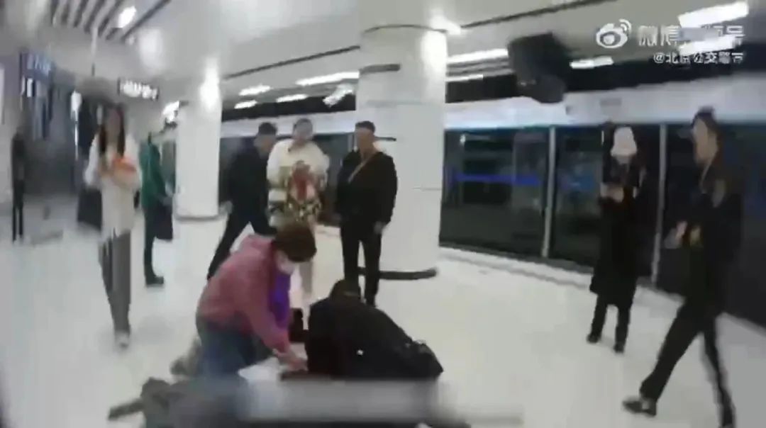 只见站台上躺着一名女子,一位民警正在用手臂垫着这位乘客的头,旁边还有一位穿黑衣服的女士正在协助急救。
