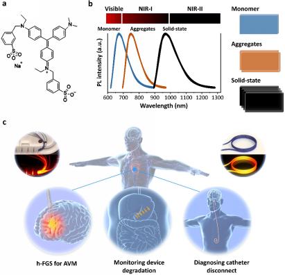 11月10日,首都医科大学附属北京天坛医院的贾旺/李德岭教授团队联合中国科学院上海药物研究所、中科院自动化研究所、四川大学、武汉理工大学、斯坦福大学等多家研究机构在《Advanced Science》期刊上发表题为《Clinically Translatable Solid-State Dye for NIR-II Imaging of Medical Devices》的研究论文。该研究聚焦医疗器械无法在体持续监测的临床问题,巧妙选取并创新性地发现了国际上第一个能直接用于临床的近红外II区(NIR-II)固态下荧光化合物,通过系列性的动物模型和临床检测,提出了将该固态成像技术用于医疗器械涂层,可通过荧光无创监测手术缝线在体降解、医用导管在体断裂等,另外可巧妙地与医用栓塞材料融合应用,固化后产生的荧光能实时引导医生精准切除血管畸形类病灶。该研究是一项医工交叉融合、设计巧妙的创新研究,其想法源于临床需求,继而从临床材料中发现其创新性性质,通过工科和材料研究阐明其科学机制,最后转化回临床创新应用,充分体现了“Bedside-Bench-Bedside”的转化医学精髓。