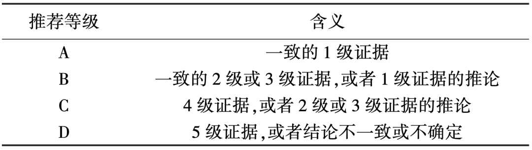 本指南工作组通过问卷调查形式,收集临床医生及患者关注的临床问题,调查收集了来自34个省、自治区、直辖市的500份医生问卷、300份患者问卷,对其进行合并去重,并根据其重要性排名及文献检索的可行性,指南工作组经过进一步讨论后最终决定纳入14个临床问题。本指南采取问题和推荐的形式,提出14个临床问题、18个推荐。证据级别(表1)与推荐等级(表2)参照英国牛津循证医学中心2009的标准[9],并在每项推荐后的括号内标注。
