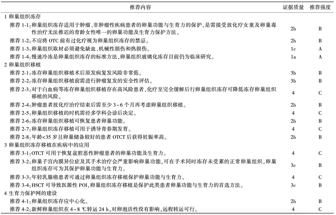推荐3-1:OTCT可用于恢复盆腔恶性肿瘤患者的卵巢功能及生育力(4,C)。