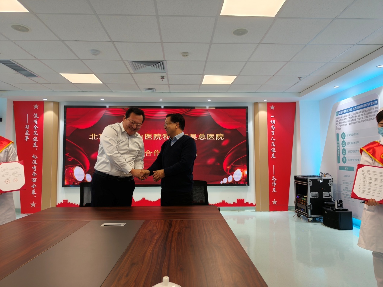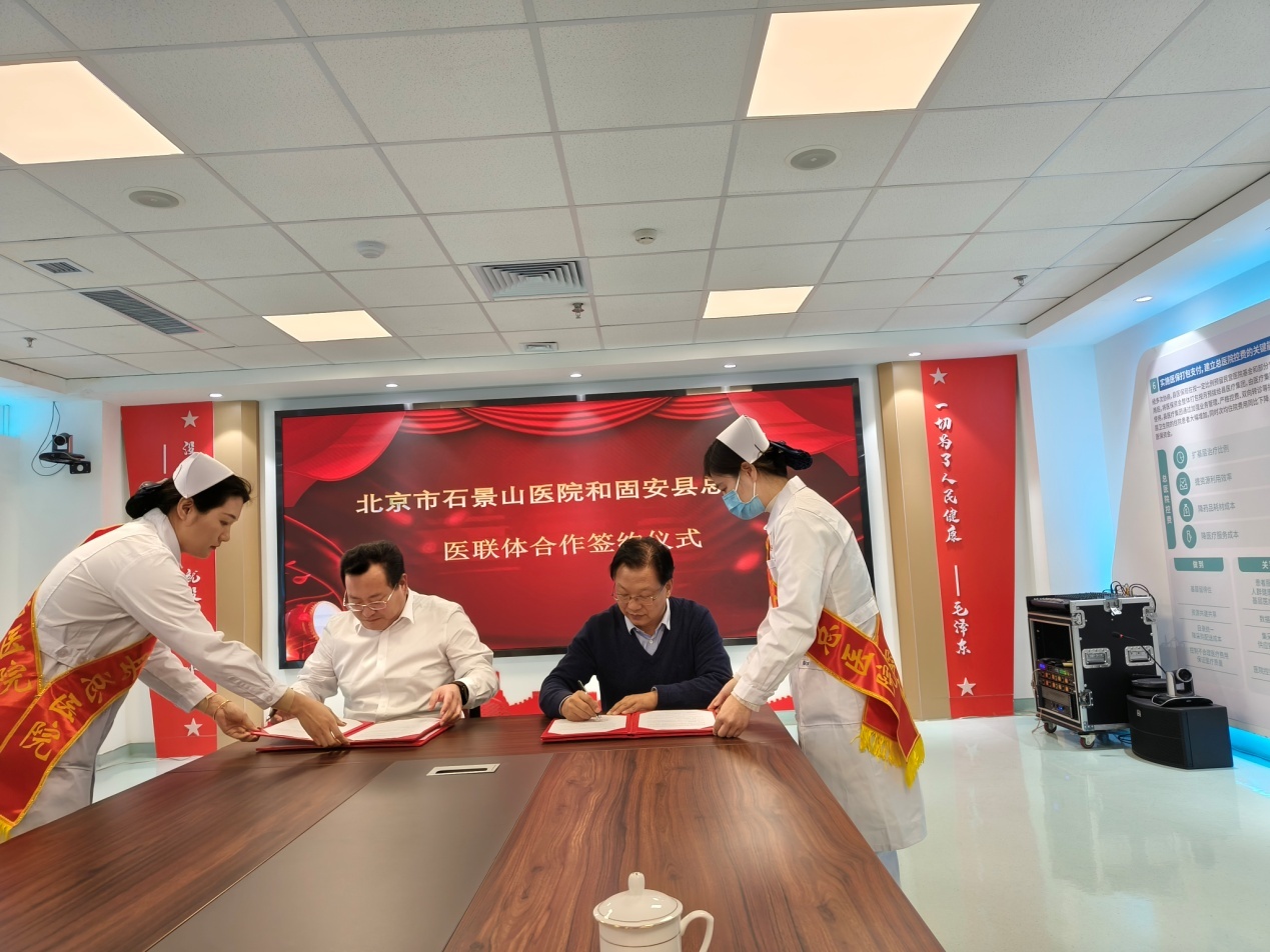 随后,在热烈的掌声中,刘鹏院长、邱运东院长分别代表石景山医院和固安县总医院签订《医联体合作协议书》,并与各位领导专家合影留念。