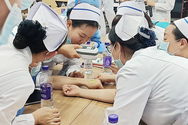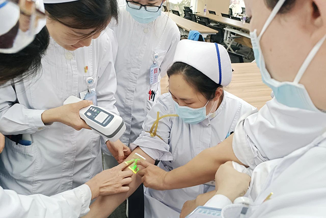 在工作坊环节,申晓红、综合神外科副护士长刘颖,创伤脑血管科、癫痫神外科、神经康复科护士长靳欢,新生儿静脉治疗专科护士陈燕,现场演示可视化红外线血管仪使用、CVC及PICC导管维护、动脉血气分析操作要点及技巧等进行带教宣讲。