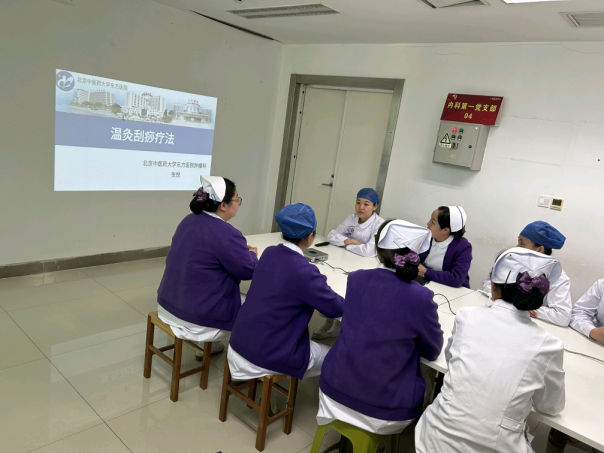 肿瘤科护理骨干张悦老师对刮痧疗法进行了手法及操作流程的指导,并开展了温灸刮痧疗法授课培训,与大家共同交流探讨如何将此项新技术运用在临床护理工作中,进而推动该科室中医护理工作再上新台阶。
