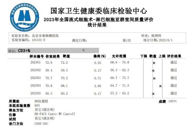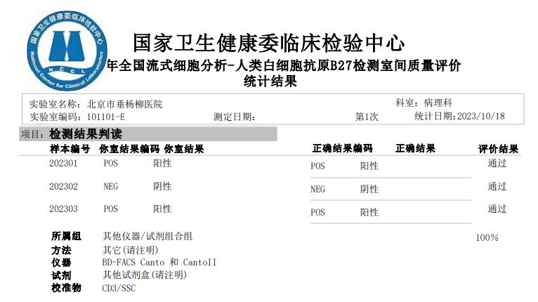 近日,在国家卫健委临床检验中心(NCCL)发布的2023年度室间质评项目成绩中,病理科流式细胞学实验室参评的淋巴细胞亚群检测及绝对计数项目和人类白细胞抗原B27检测项目均以满分的成绩通过室间质评,彰显了北京市垂杨柳医院病理科高度稳定、专业可靠的检测实力。