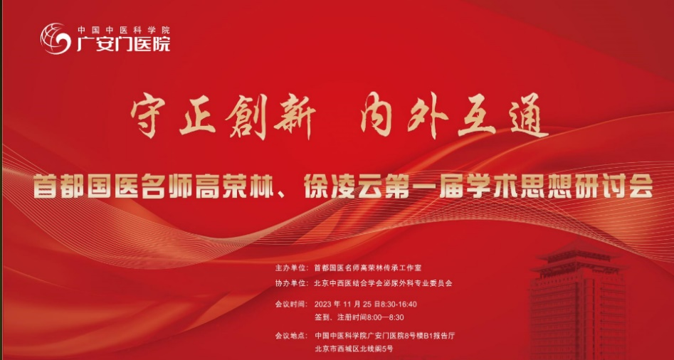 11月25日,首都国医名师高荣林、徐凌云第一届学术思想研讨会在我院学术报告厅举办。会议由首都国医名师高荣林传承工作室主办,北京中西医结合学会泌尿外科专业委员会协办。首都国医名师高荣林、徐凌云、刘景源,我院老年病专家朱建贵教授、院长刘震出席开幕式。全国各地的高荣林、徐凌云弟子、学生及知名专家学者等近200人现场参会。大会开幕式由北京中医药大学第三附属医院人事处处长李平主持。
