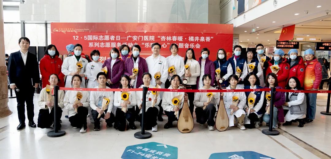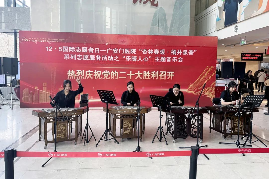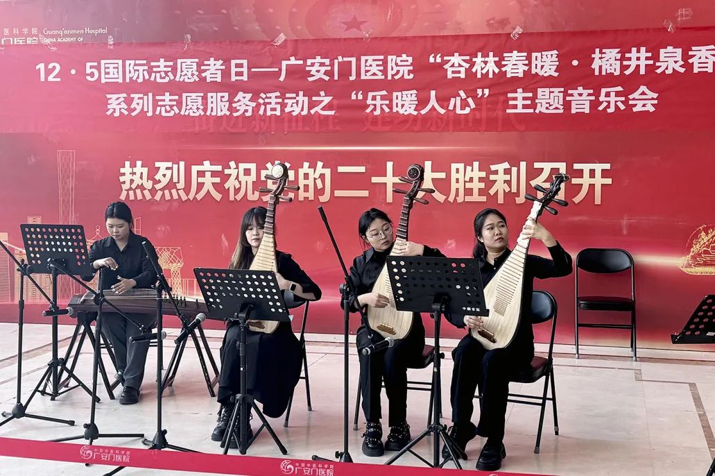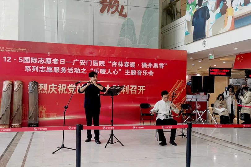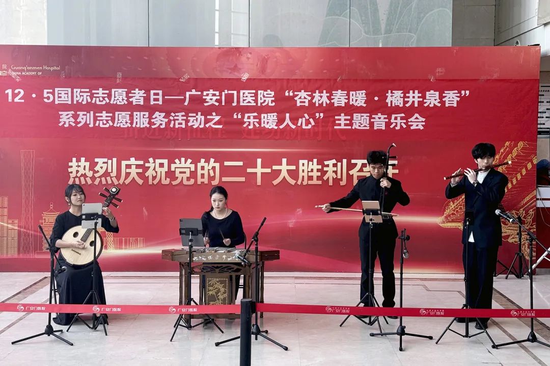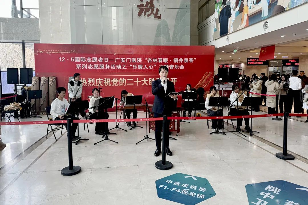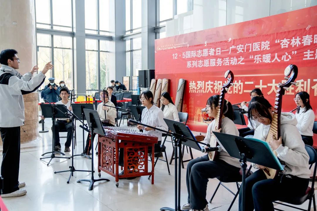 在“12.5国际志愿者日”来临之际,12月5日,社工部联合北京中医药大学民乐团、中国音乐学院表演团队倾力打造的“乐暖人心”主题音乐会在医院门诊大厅举行。音乐会上,广安门医院党委书记王笑频、副院长严华国及部分职能部门负责人出席,并亲切问候了广安门医院志愿者、青年志愿者代表和演出的大学生志愿者们。