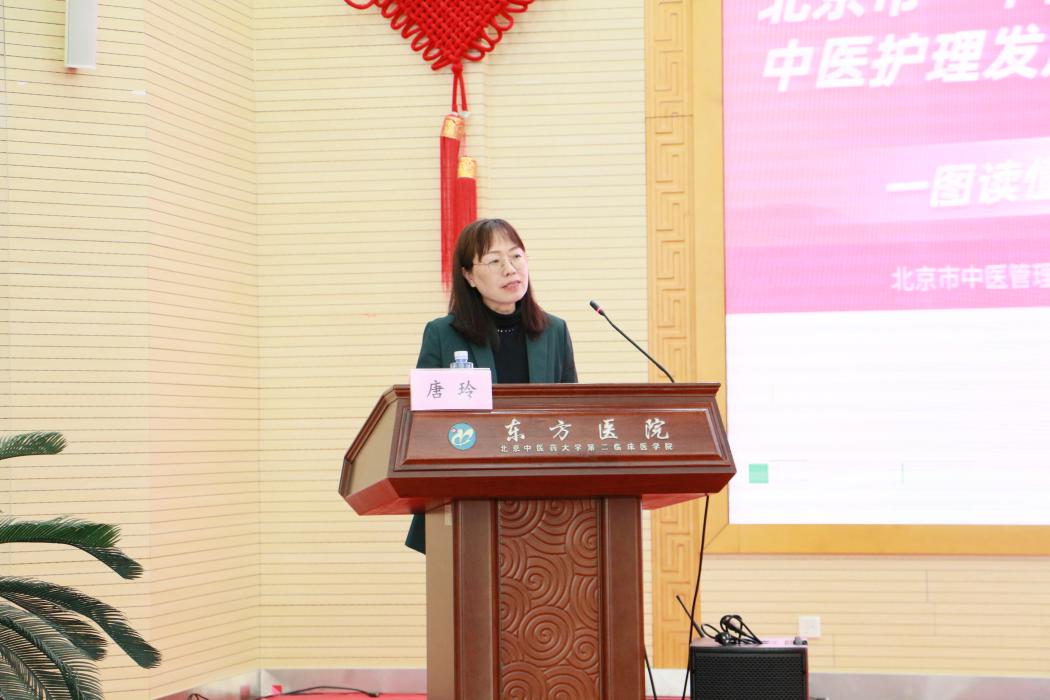 北京市中医护理能力提升工程办公室主任、北京中医药大学东方医院护理部主任唐玲以“中医护理门诊标准化建设思路”为题进行专题讲座,回顾了中医护理门诊的发展历程,在北京市中医管理局指导下,统筹规划、顶层设计,并以东方医院“四专”中医护理门诊体系为例展示中医护理优势特色,同时介绍了中西医结合护理学术传播体系“两刊一本一库”,为护理人员搭建了中医护理交流与传播平台。
