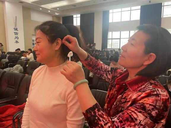 北京中医药大学东方医院乳腺科副主任赵立娜以“借耳一用可知可治病”为题,讲解了利用耳穴视诊、触诊、探测法迅速知病,精准诊病;利用耳穴放血、手法、压豆“绿色”治病,有效防病,探寻耳医学的发展渊源,让护理人员更快、更好地将耳穴诊治技术应用于临床,解决临床常见问题,并现场演示了操作方法。