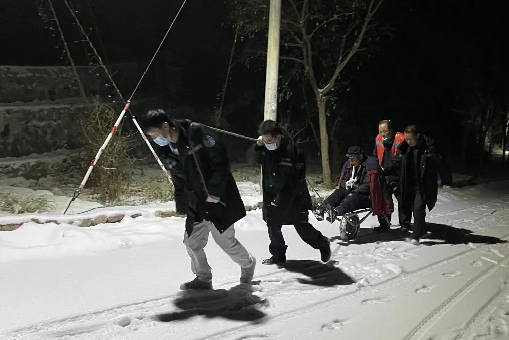 由于天近傍晚加上雨雪天气,增加了救治难度。风雪中,几个人的脸早已经被冻得通红,双脚也冻的麻木了,可是他们没有一句怨言,相互配合着,两人拉车,一人推着,一人扶着患者,不顾自身安危,顶着风雪踏冰前行,朝着生命的方向奔跑,用坚定的身影诠释了“生命相托、分秒把握”的铮铮誓言。在急救人员近1个多小时的不懈努力下,徒步约3km抵达现场,他们顾不上劳累立即进行急救。见患者意识清楚,生命体征平稳,右肩损伤活动受限待查,现场固定后平安送达密云区医院急诊接受进一步治疗。