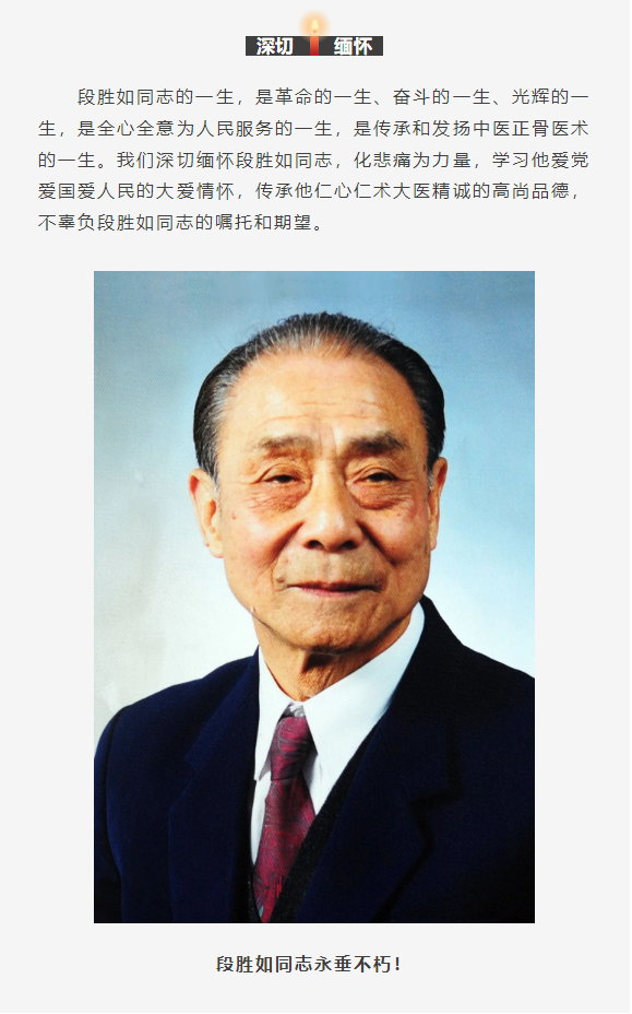 段胜如同志热爱祖国,忠诚于党,在党67年,行医73年,他牢记周总理“发扬祖国医药遗产,为社会主义建设服务”的指示,为中医正骨疗法的传承和发扬,呕心沥血、鞠躬尽瘁。他深爱祖国的传统医学事业,做到了“古法之佳者守之,垂绝者继之,不佳者改之,未足者增之,西方医学可采者融之。”他对每一个病人一丝不苟的诊治,对祖国传统医学锲而不舍的追求和坚韧执着的奉献,充分体现了一位老共产党员的崇高品格。
