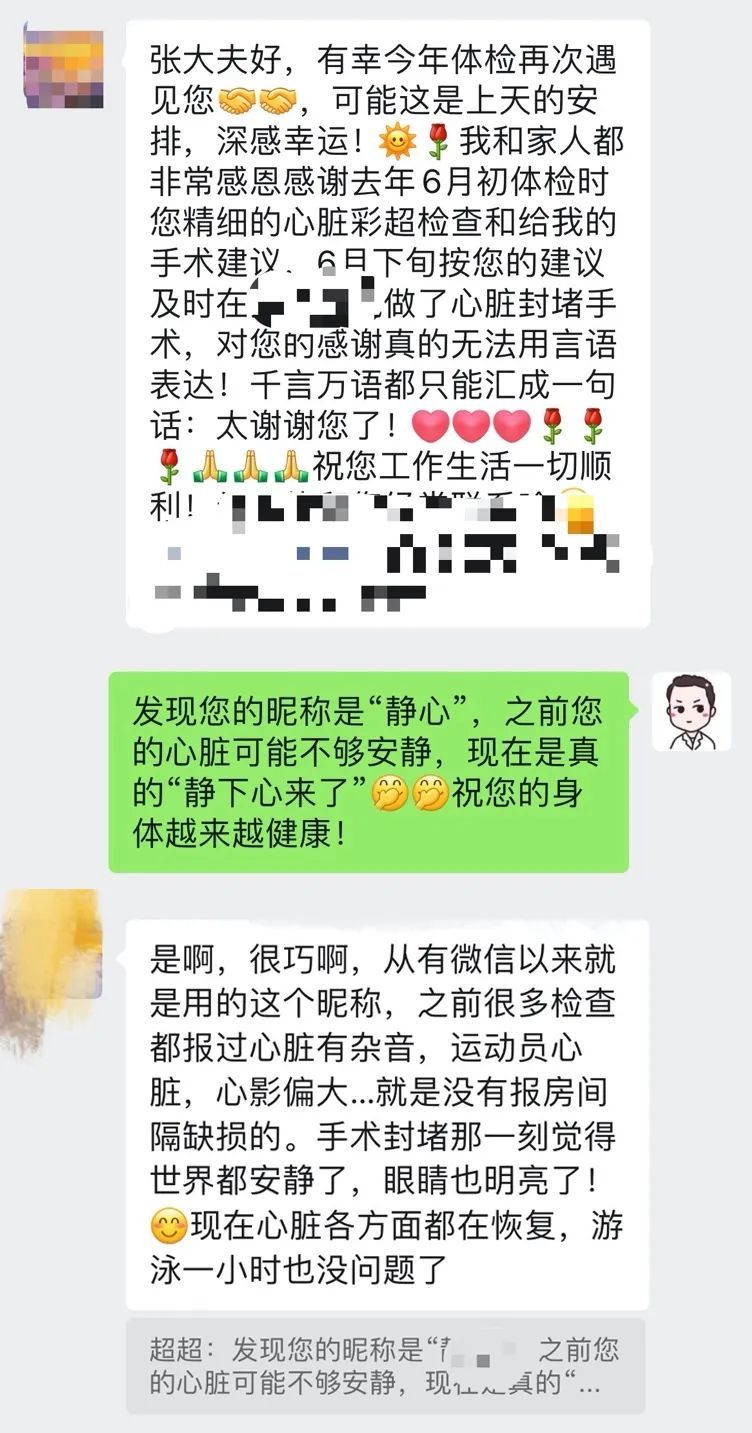 再次体检时“意外”的重逢,诉说着过往的就诊经历,房间隔缺损的成功封堵也“打开”了患者的心扉。医生也许无法对患者的病痛感同身受,但医患齐心协力共同努力治愈疾病是永恒不变的心愿。