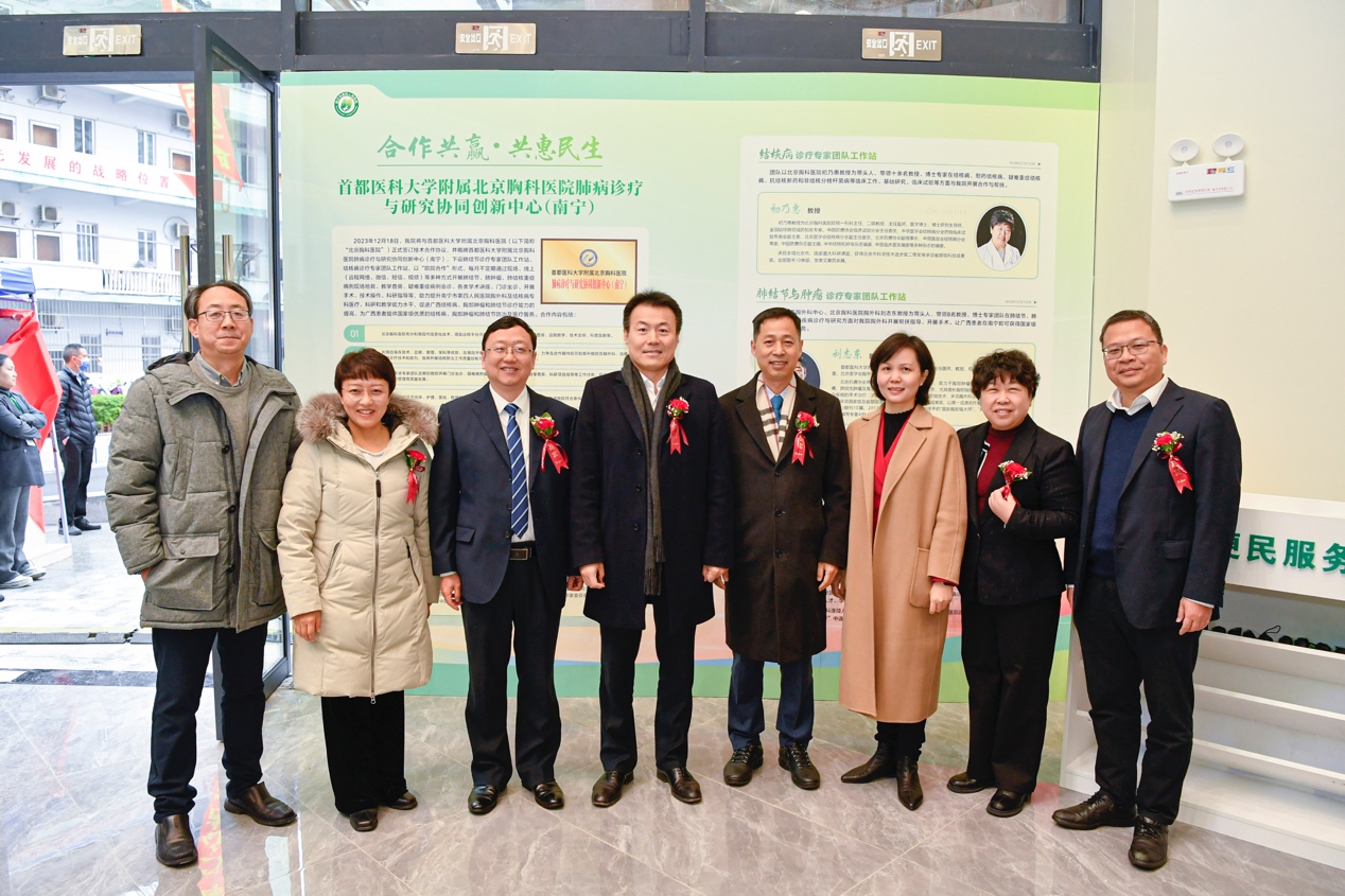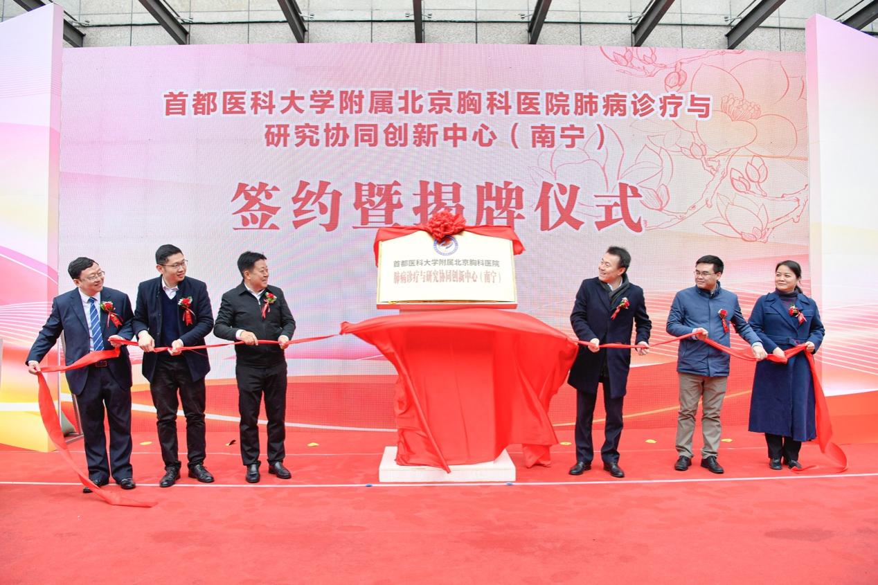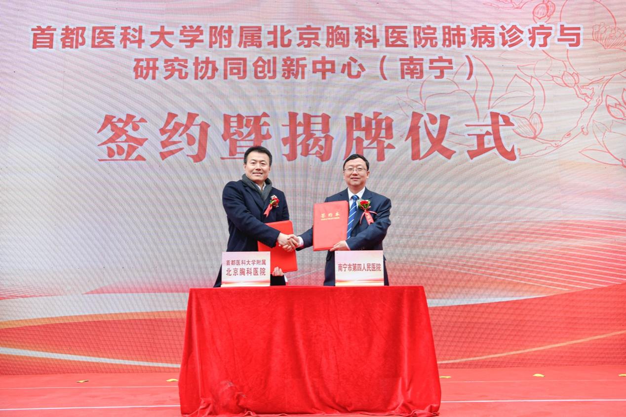 12月18日上午,北京胸科医院院长李晓北和南宁市第四人民医院院长阳世雄共同签署《首都医科大学附属北京胸科医院在南宁市第四人民医院设立首都医科大学附属北京胸科医院肺病诊疗与研究协同创新中心(南宁)协议书》,并与南宁市人民政府、卫健委等相关领导一起为首都医科大学附属北京胸科医院肺病诊疗与研究协同创新中心(南宁)揭牌。