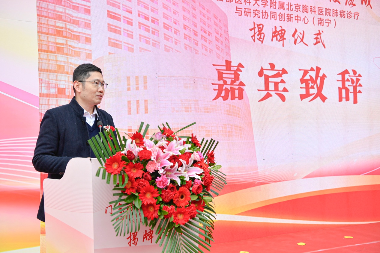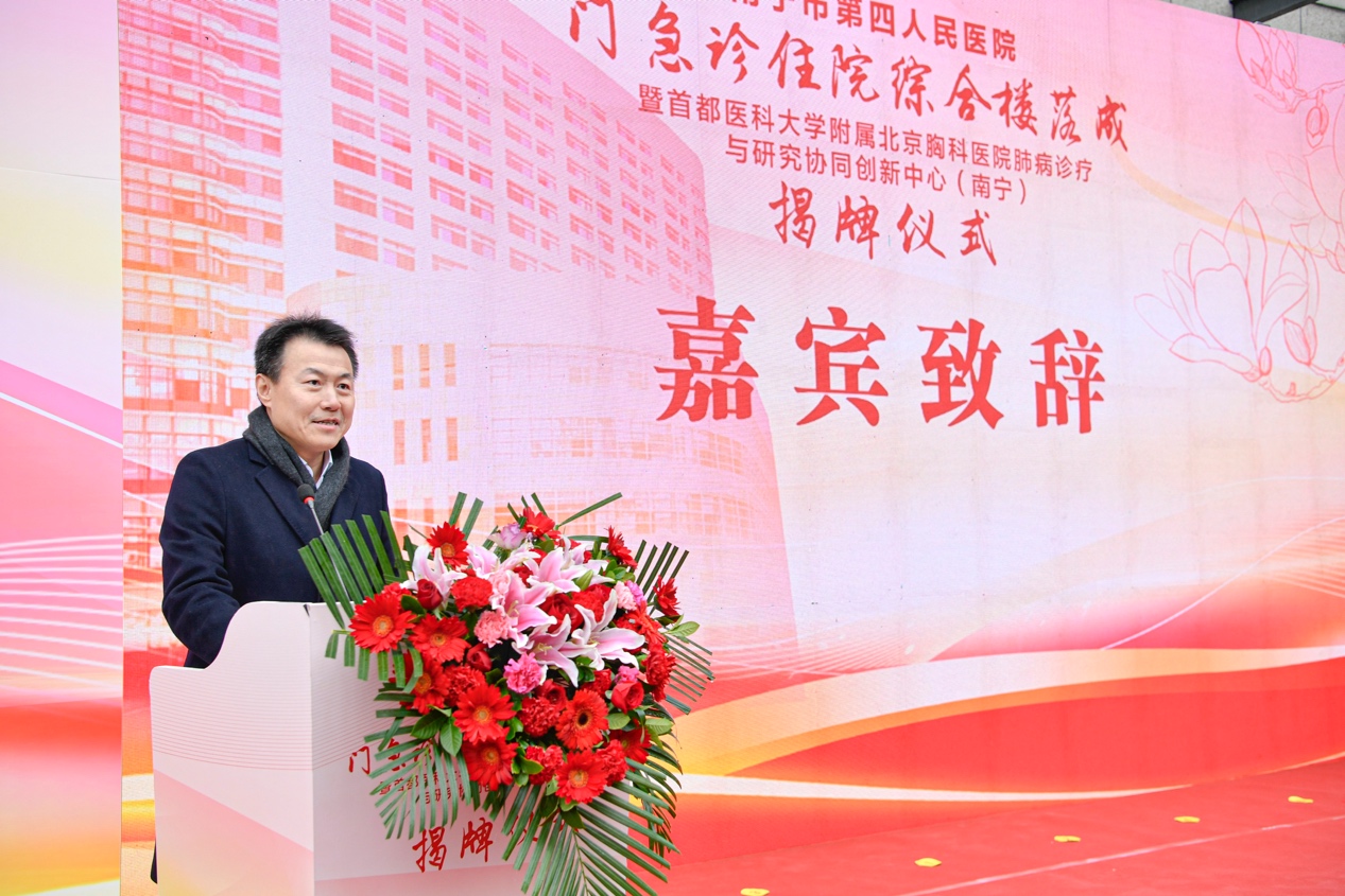 北京胸科医院院长李晓北也在揭牌仪式上致辞。他说,北京胸科医院成立于1955年,几十年的学术积淀和优秀的传统让北京胸科医院一直在胸部疾病这一领域发挥着重要的作用。作为国内知名的以胸部疾病为专业特色的国家三级甲等专科医院,北京胸科医院在结核病和胸部肿瘤两大学科领域具有显著的优势和丰富的经验,有信心和南宁市第四人民医院在医疗服务、学科建设、科研教学等方面开展全方位深入合作。肺病诊疗研究与协同创新中心的建立,将汇聚北京胸科医院和南宁市第四人民医院的优秀医疗团队和资源,为南宁市民提供优质的肺病诊疗服务,为肺病患者带来更加精准、个性化的治疗方案。同时,双方还将积极开展科研合作,探索肺病发病机制和治疗方法,为肺病防治事业贡献更多的智慧和力量。
