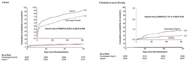 高危颅内外大动脉狭窄强化药物治疗(INSPIRES)是一项由研究者发起、随机、双盲、安慰剂对照、2×2析因、多中心临床试验,其抗板治疗臂旨在评估氯吡格雷联合阿司匹林双联抗血小板治疗对比单独阿司匹林治疗发病72小时内的动脉粥样硬化性急性缺血性卒中的有效性和安全性。研究共纳入了来自全国222家医院的6100例轻型缺血性卒中(NIHSS≤5)或高危短暂性脑缺血发作(ABCD2≥4)患者,在发病72小时内随机分配至双联抗板治疗组(氯吡格雷+阿司匹林治疗21天,后改为氯吡格雷治疗69天)或标准抗板治疗组(氯吡格雷安慰剂+阿司匹林治疗90天)。研究主要结局是90天内的缺血性或者出血性卒中,主要安全性结局是90天内的中重度出血(GUSTO标准)。最终,双联抗板组的222例(7.3%)受试者和标准抗板组的279例(9.2%)受试者达到主要结局(HR, 0.79; 95% CI, 0.66-0.94; P=0.008);两组各有27例(0.9%)和13例(0.4%)受试者达到主要安全性结局(HR, 2.08; 95% CI, 1.07-4.04; P=0.03)。这一结果提示,发病72小时内的动脉粥样硬化性急性缺血性卒中的90天卒中复发方面,氯吡格雷联合阿司匹林双联抗血小板治疗显著优于阿司匹林单药治疗,伴有中重度出血风险的轻度增高。