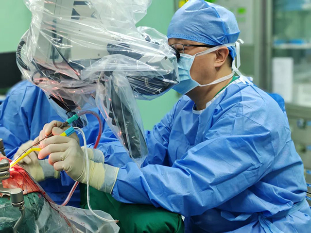 10月17日下午15点40分,毛女士被推进手术间。牛建星团队早已准备充分,麻醉、摆放体位、消毒、铺单……1个小时过后,肿瘤充分暴露,手术进入到肿瘤切除部分的关键期。牛建星主任介绍:“显微镜下病变大小约70mm×65mm×50mm,呈暗红色,质软,血运丰富,肿瘤与脑组织边界清楚,首先离断肿瘤基底血运,然后显微镜下沿肿瘤边界分离全切病变,同时瘤周正常组织的回流静脉保护完好。