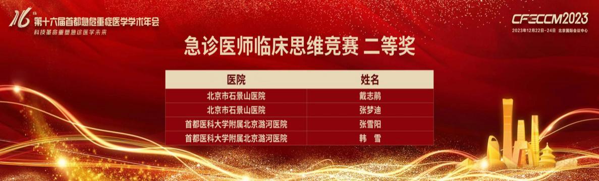 由首都医科大学急诊医学系等单位共同主办的“第十六届首都急危重症医学学术年会”于2023年12月22日至12月24日在北京国际会议中心隆重召开。石景山医院作为重要的成员单位,急诊科张红主任携科里多位骨干积极参会,感受科技革命,领略生命知识的最前沿。