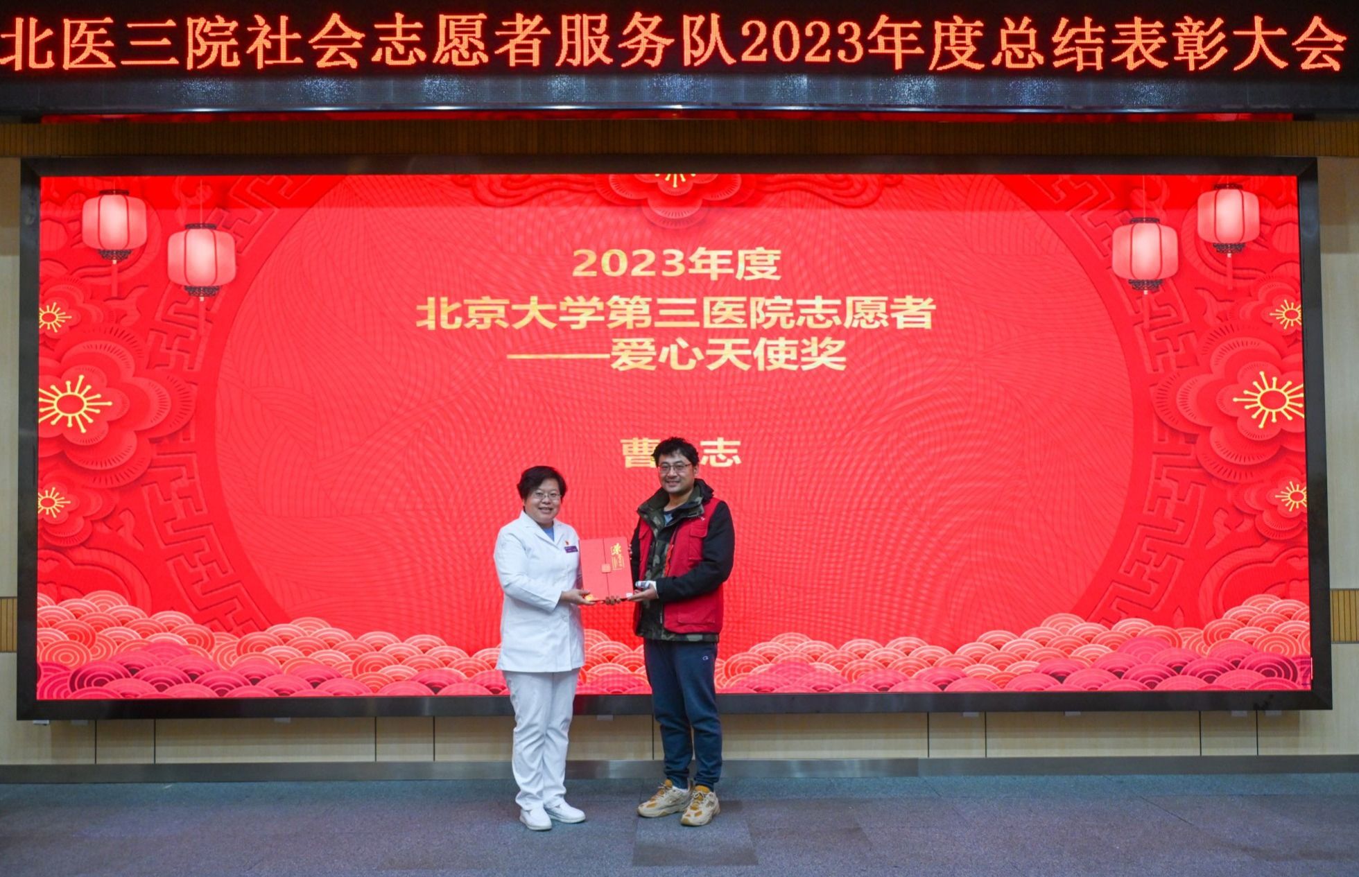 在颁奖仪式上,授予杨姝珣、马丽红、马秀华、谢静颖、王枫等10人“十佳社会志愿者”称号;授予蔡燕、汪英、陈晓莎、黄英等67人“优秀志愿者”称号。为感谢志愿者们在参与医院各项活动中的积极参与,以及在医务社工组织的各项服务中的出色表现,分别为张秀静、由武全、张莉、孔良翮等8位志愿者颁发“爱心风采奖”、为高学蓉、蔡燕、刘燕等9位志愿者颁发“爱心伙伴奖”。北京市第549位造血干细胞捐献者曹志荣获了“爱心天使奖”。曹志不仅是社会志愿者服务队的优秀志愿者,同时也是北京大学第三医院一名优秀急诊科护士。