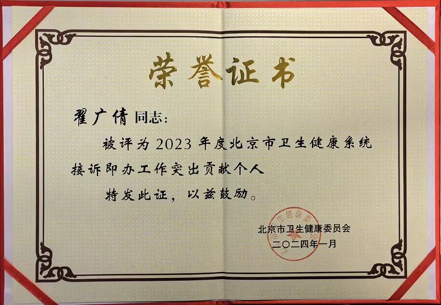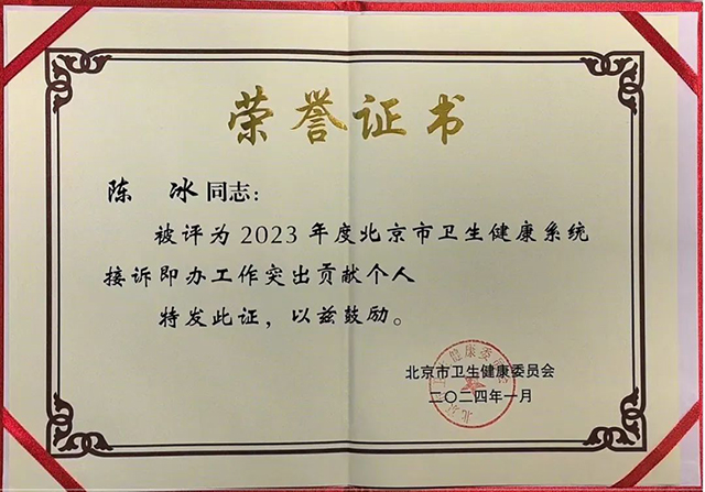 航空总医院高度重视接诉即办工作,在院党委书记的指导下,成立了接诉即办专班,高质量高效率开展工作,用心用情为民解忧。自2023年6月份起,航空总医院接诉即办工作在北京市卫生健康系统月度考核成绩均为100分,工作进步突出。市卫生健康委为表彰先进典型,激发全系统做好接诉即办工作的责任感、使命感、荣誉感,特授予医院医务部陈冰、翟广倩“北京市卫生健康系统接诉即办工作突出贡献个人”称号。