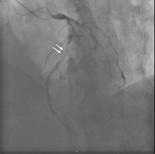 左图:术前冠脉造影(白色箭头指示前降支支架内严重狭窄)