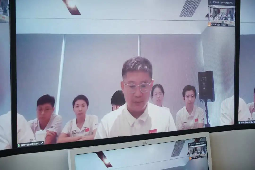 连线中,援柬医疗队队长、急诊科副主任医师远庚首先作《援柬任务半年工作汇报》。通过半年的医疗援助,我院医疗队充分发挥中医药特色优势,中医疗效得到柬埔寨民众的广泛认可。依托中国-柬埔寨中医药中心,积极开展义诊、学术论坛及适宜技术培训等活动,为中医药在柬落地生根打下坚实基础,为巩固中柬命运共同体贡献力量。