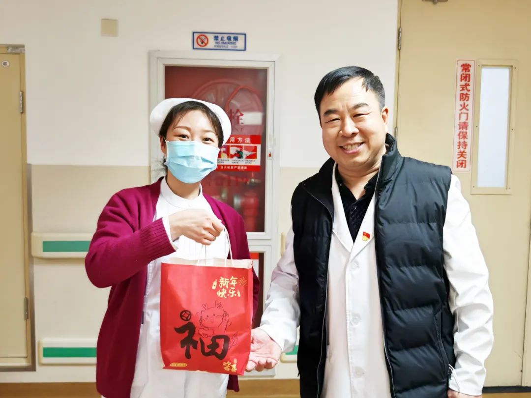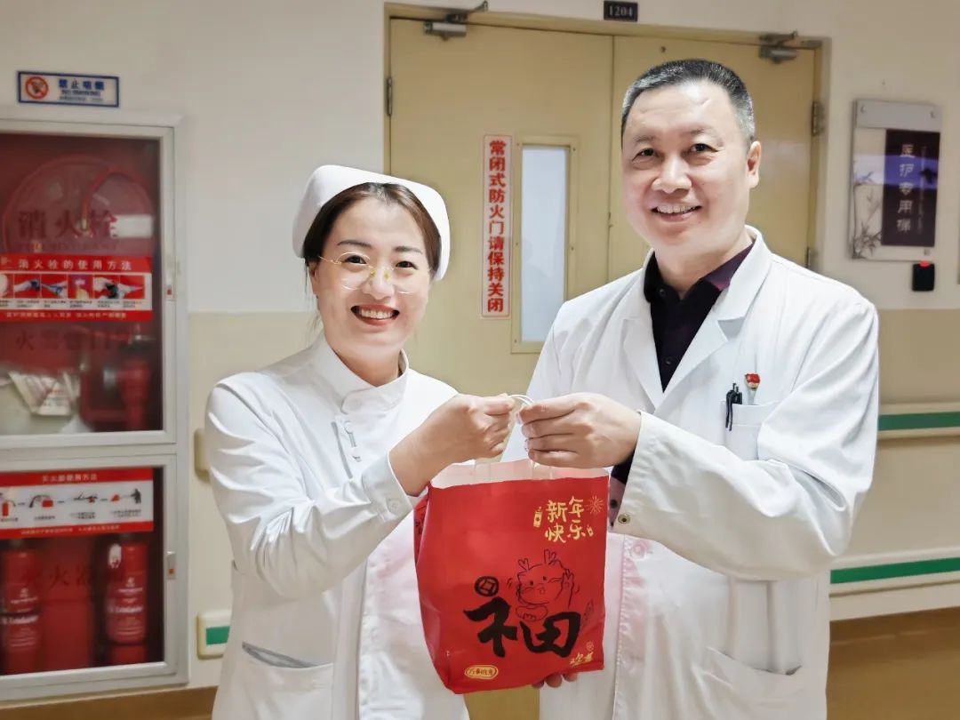 每到一处,院领导们都热情地与坚守在岗位的医务人员亲切握手、交谈,并致以节日的问候:“大家新春快乐、身体健康、万事如意!”同时为大家送上暖心的慰问品,并嘱咐大家春节期间强化责任担当,加强值班值守,一如既往地为人民提供优质的医疗服务,并守护好在院患者的生命安全,全心全意护卫人民健康。