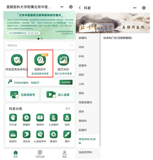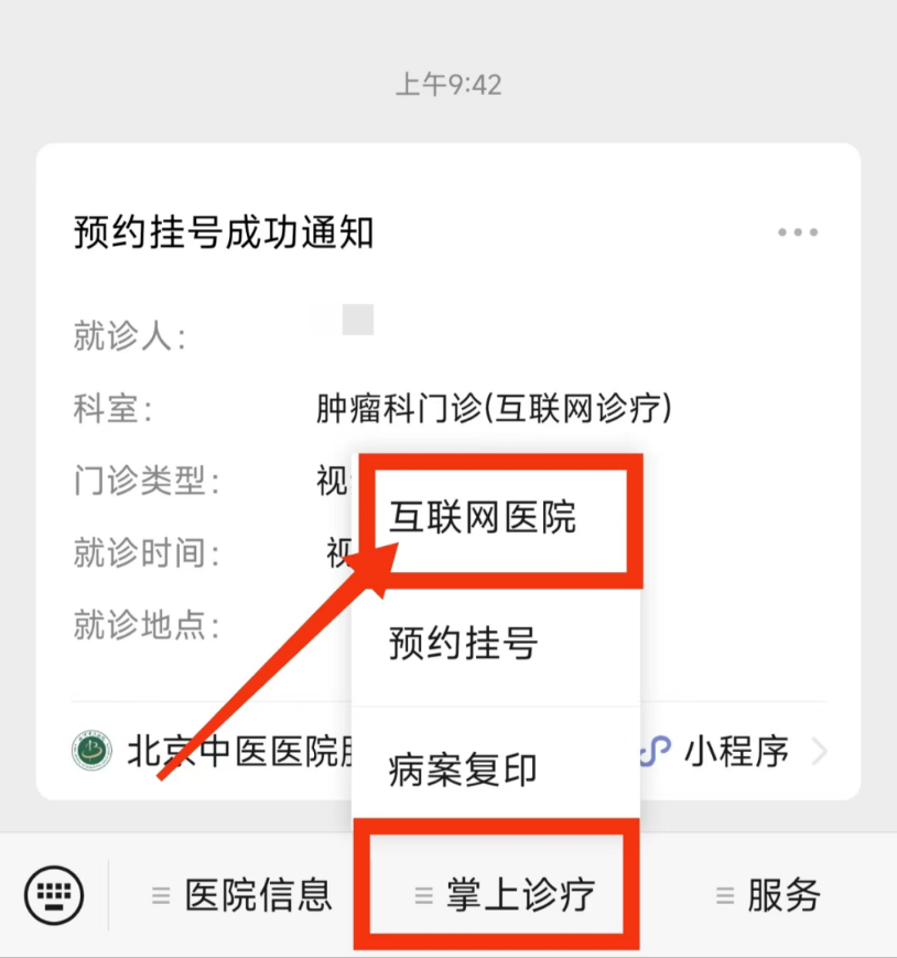 第一步:搜索“首都医科大学附属北京中医医院”微信公众号,点击【掌上诊疗-互联网医院】,进行预约挂号,也可关注我院小程序进行预约挂号。