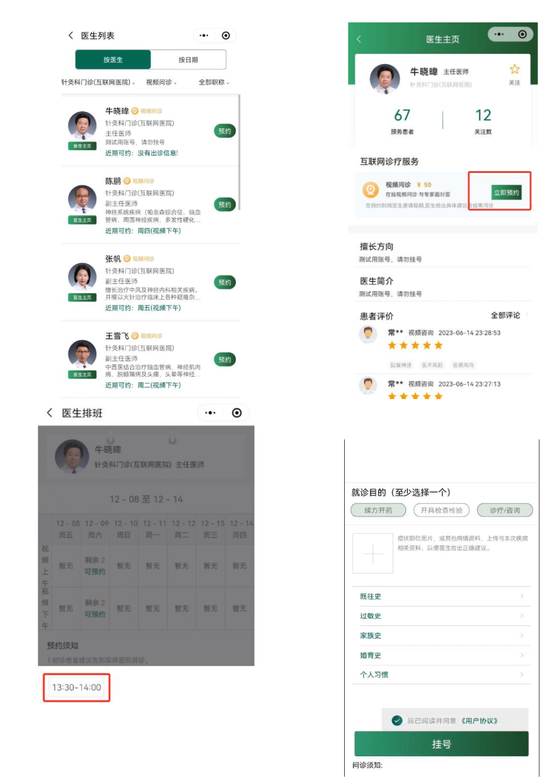 第二步:进入互联网医院界面点击【视频诊疗】,选择科室、医生、就诊时段、填写病情及就诊目的,选择是否医保/自费、是/否住院患者,点击【挂号】,医保患者确认支付后完成线上移动支付挂号。(住院中患者,请务必选择是自费、是住院,否则将影响出院结算。)