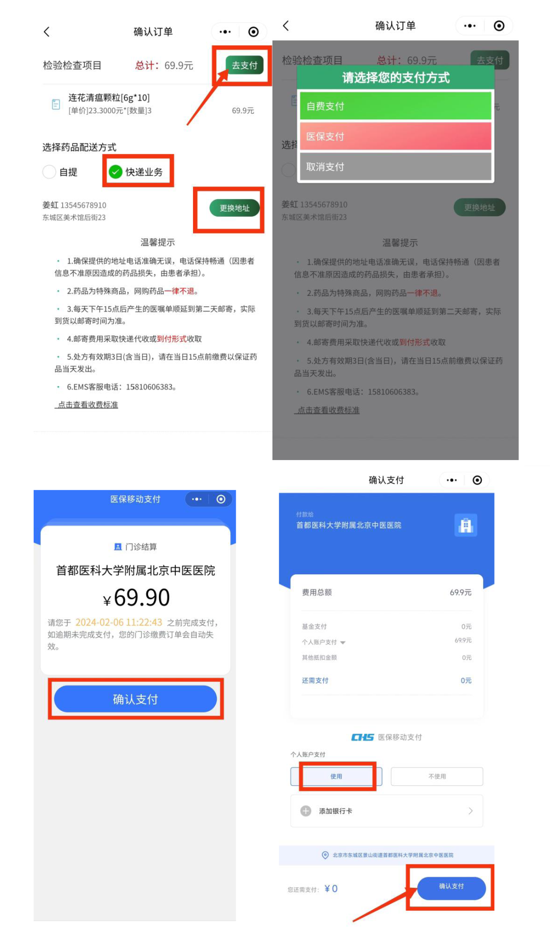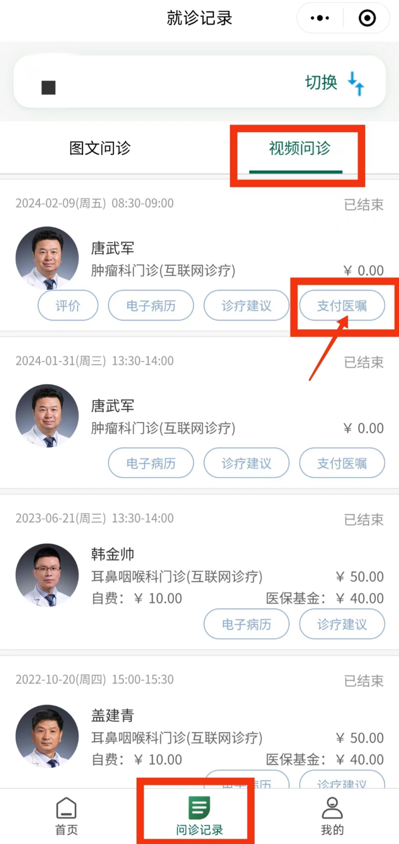诊疗结束后,点击【问诊记录】-【视频问诊】-【支付医嘱】,跳转到详细医嘱界面,选择自提或者快递业务(若选择快递业务请填写详细邮寄地址),点击【去支付】-【医保支付】,点击【确认支付】进入医保分解界面,继续点击【确认支付】,完成支付。