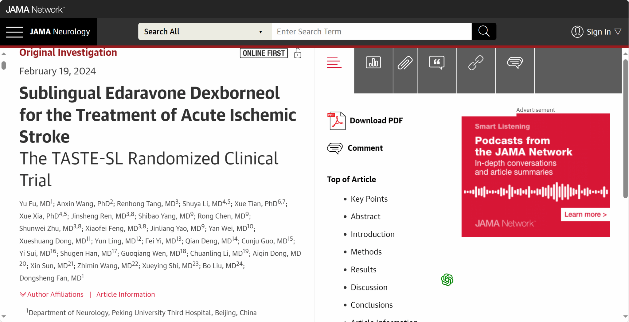 2024年2月19日,北京大学第三医院神经内科樊东升教授团队在神经病学领域权威期刊《美国医学会杂志:神经病学》(JAMA Neurology)上发表题为“依达拉奉右坎醇舌下片治疗急性缺血性卒中:TASTE-SL随机临床试验”(Sublingual Edaravone Dexborneol for the Treatment of Acute Ischemic Stroke: The TASTE-SL Randomized Clinical Trial)的文章,显示依达拉奉右莰醇(先必新)舌下片能够显著改善发病48小时内的急性缺血性脑卒中(AIS)患者第90天神经功能结局。
