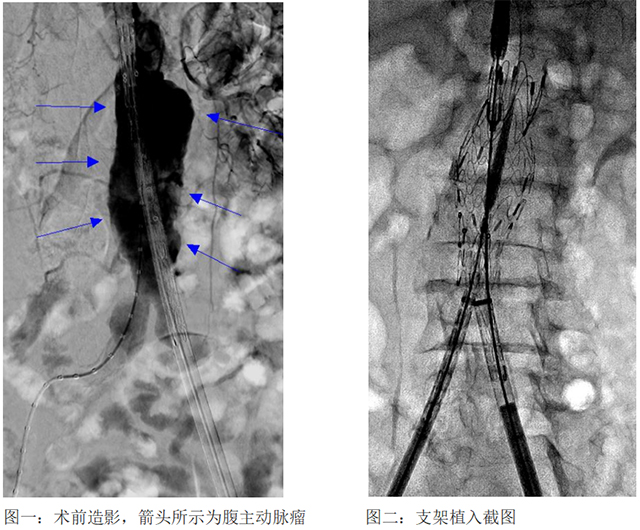 与传统的外科手术相比较,腹主动脉瘤腔内修复术是在透视下,经双侧股动脉直接穿刺预留缝合线结,将折叠的覆膜金属自膨支架送入腹主动脉内,将覆膜支架固定于动脉瘤近端的正常动脉壁,远端通过支架拼接建立分叉型的远端血流通路,保障盆腔和下肢血供。通过覆膜支架隔绝了腹主动脉高压血流对瘤壁的冲击,同时瘤壁与人工血管之间继发血栓机化,从而防止动脉瘤的继续增大与破裂。目前,介入治疗手术因其优势而成为治疗腹主动脉瘤的主流治疗方式。