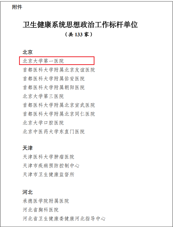 近日,在国家卫生健康委直属机关党委指导下,中国卫生健康思想政治工作促进会于2023年组织开展了卫生健康思想政治工作标杆单位培育选树活动。经过实地调研,组织各分会会长、特聘专家等领导和专家集中进行审核筛选,上报国家卫生健康委直属机关党委审定,最终选树了133家卫生健康思想政治工作标杆单位。北京大学第一医院获评“卫生健康系统思想政治工作标杆单位”。