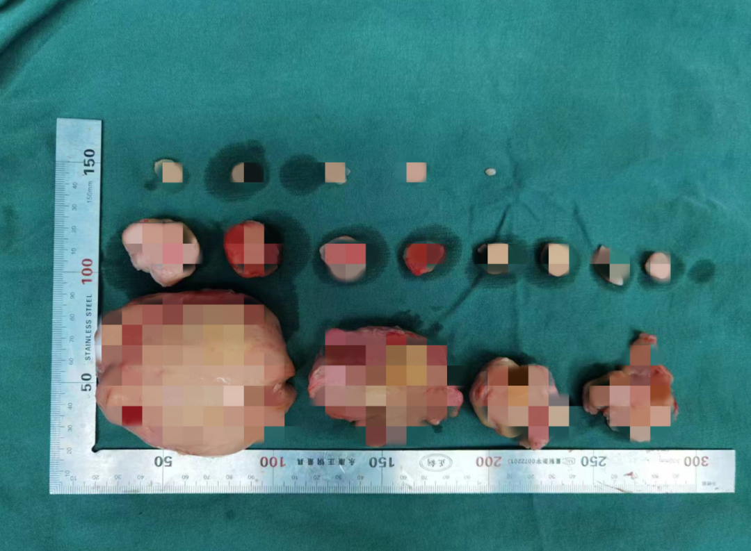 1颗、2颗、3颗……鸡蛋大小、花生米大小、黄豆大小……两位医生谨慎、小心又耐心地处理这些大大小小的肌瘤。经过3小时的手术探寻肌瘤、逐个剥除,主刀医生共摘除整整17颗肌瘤,最大的达到9cm!