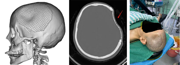 入院后,穆苍山为患者制定了完善的翻修手术方案。通过3D打印技术,个性化定制PEEK外形,完善术前检查,耐心向患者家属解释手术治疗方案和PEEK设计过程,以及手术后注意事项。得到患者和家属同意后,神经外十科团队在全麻下为患者行原钛网取出同时PEEK翻修手术。术后,患者恢复顺利,1周后拆线回家休息。