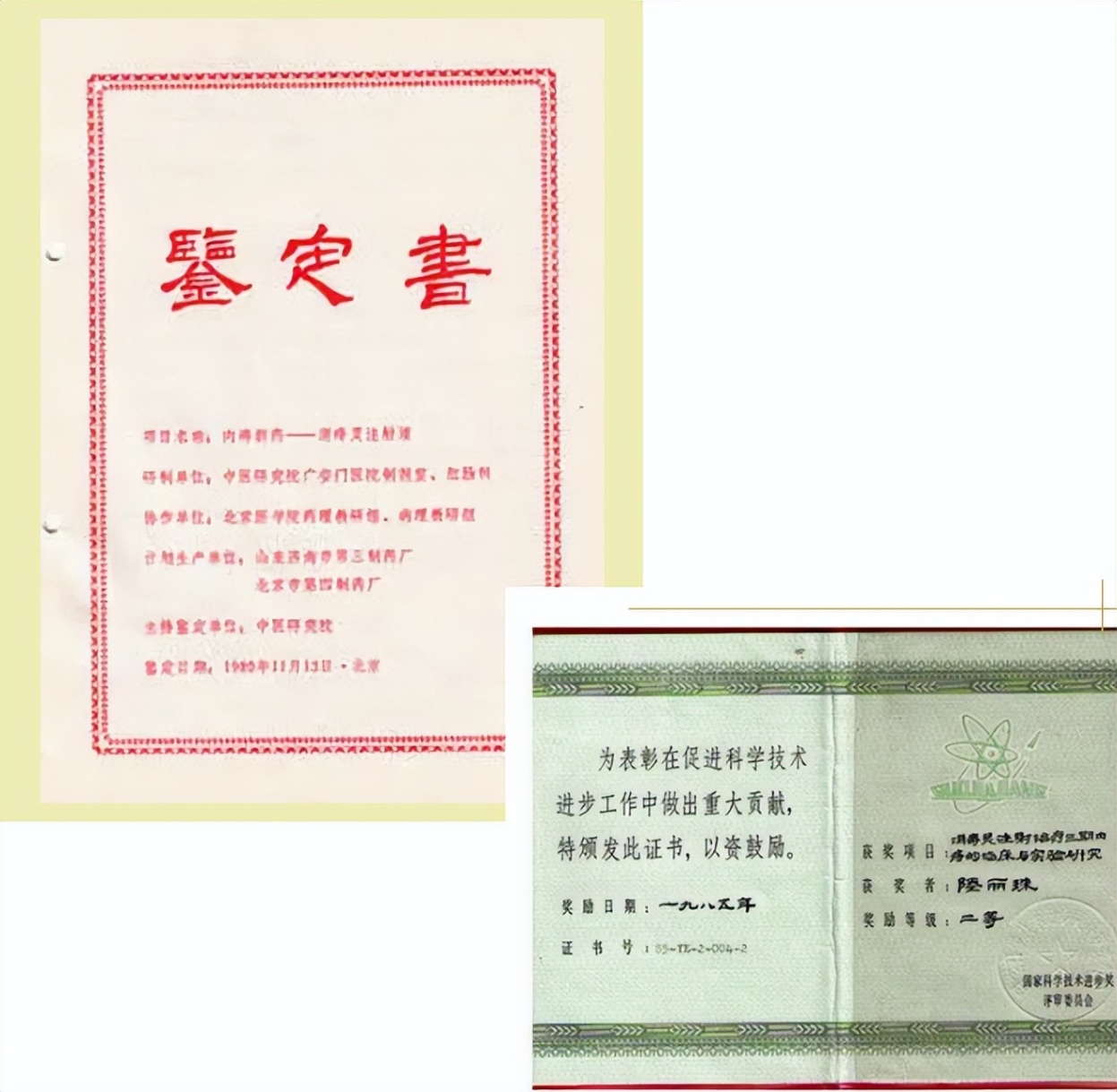 消痔灵注射液是广安门医院肛肠科专家史兆岐提出的方子,他想要把药注射到痔疮里去。起初,方子很大,药味多,药熬出来非常浑浊,打到痔疮里效果也不好。后来他和我一起商量办法,我就给他稍微改一改,我不能给他大改,改变了原处方的意图不起作用也不行。所以在这个比例情况下,我减减量,增加过滤、沉淀,最后研制成功了。1985年,我们的研究课题《消痔灵注射治疗三期内痔的临床与实验研究》获得了国家科技进步二等奖。我作为第二研究者,主要负责了消痔灵注射液的研制。