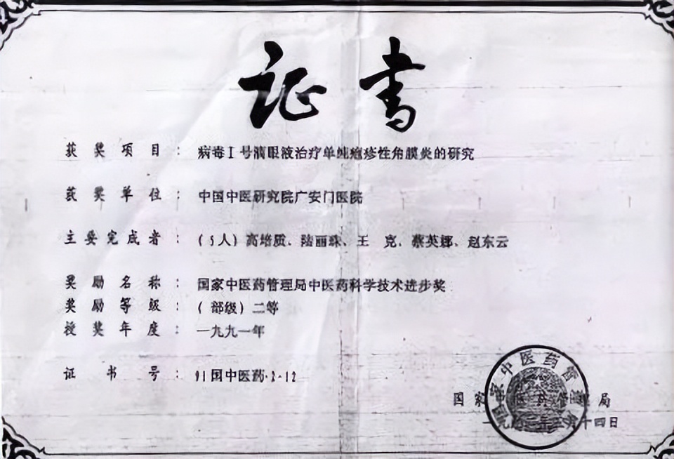 在病毒1号滴眼液治疗单纯疱疹性角膜炎的研究中,我参与并担任了课题副组长。这个滴眼液的方子是我的爱人唐由之首先提出的,他当时是广安门医院眼科主任。在角膜炎的治疗中,没有特效中药滴眼液,吃汤药不如直接点到眼睛里作用大。眼科提出想要研发一款眼药水,我就开始着手研究中药滴眼液。