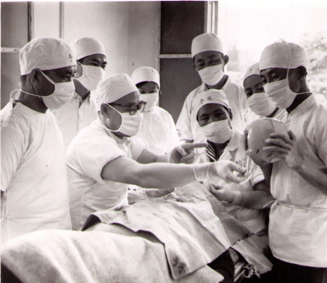 1970年,唐由之(左二)指导前来学习白内障针拨术的各地医生。