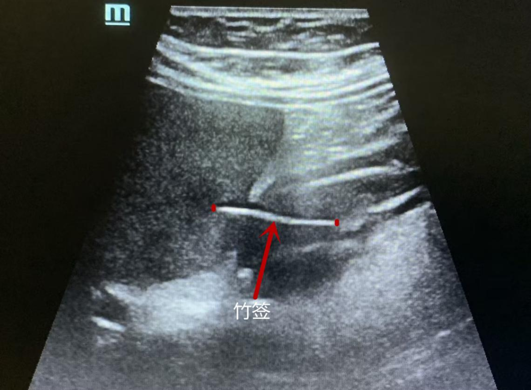 超声科谭庆亭医师反复检测,在患者的胃窦处发现了一个细细长长的异物,经张华斌主任当场会诊后,明确了诊断。此时,患者才努力地回想起,自己发病的前一天曾用竹签吃过包子。超声检查发现这根竹签已经刺破了胃壁,扎入了肝脏。