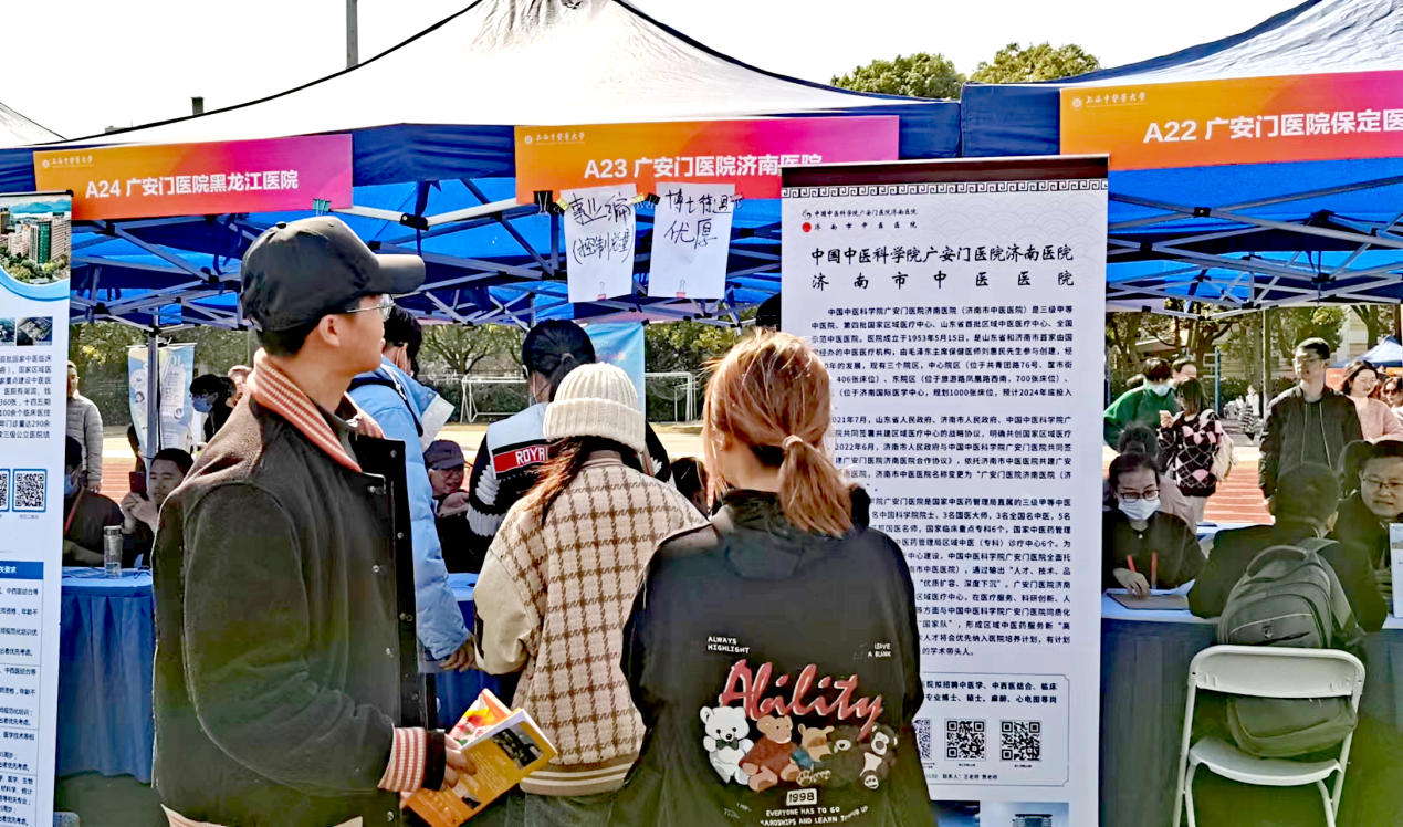 3月20日,中国中医科学院广安门医院组织广安门医院保定医院、济南医院、黑龙江医院3家国家区域医疗中心建设单位及广安门医院南区,参加上海中医药大学2024年应届毕业生春季校园招聘会。