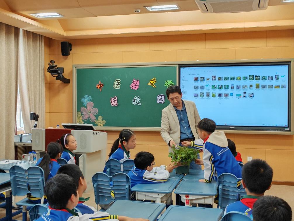 为了让同学们更加直观地了解中药植物,高老师还准备了一棵正在开花的丹参植株让大家参观。孩子们好奇地围拢过来,用手轻轻触摸,用鼻子仔细嗅闻,仿佛在探索一个神秘的新世界。高老师结合植物给大家讲解了丹参的药用部位以及“茎四棱、叶对生”的唇形科特征,让学生们对中药植物有了更直观的认识。